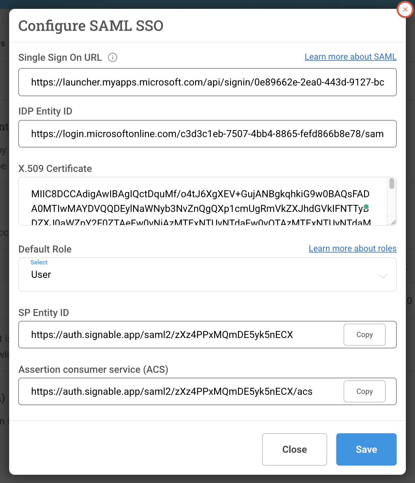 Due to the way the values are presented during the Entra configuration, it could be misconstrued - if you encounter any issues upon completed set-up, don't hesitate to contact us at help@signable.com.